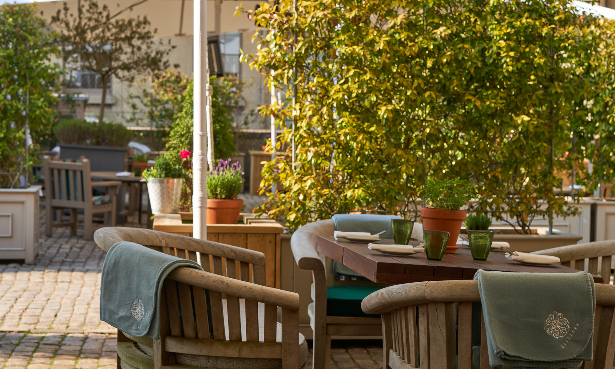 Inspired by the warmth and charm of an Alpine ski chalet, this discreet winter terrace offers an intimate setting for entertaining in true Cliveden style.
